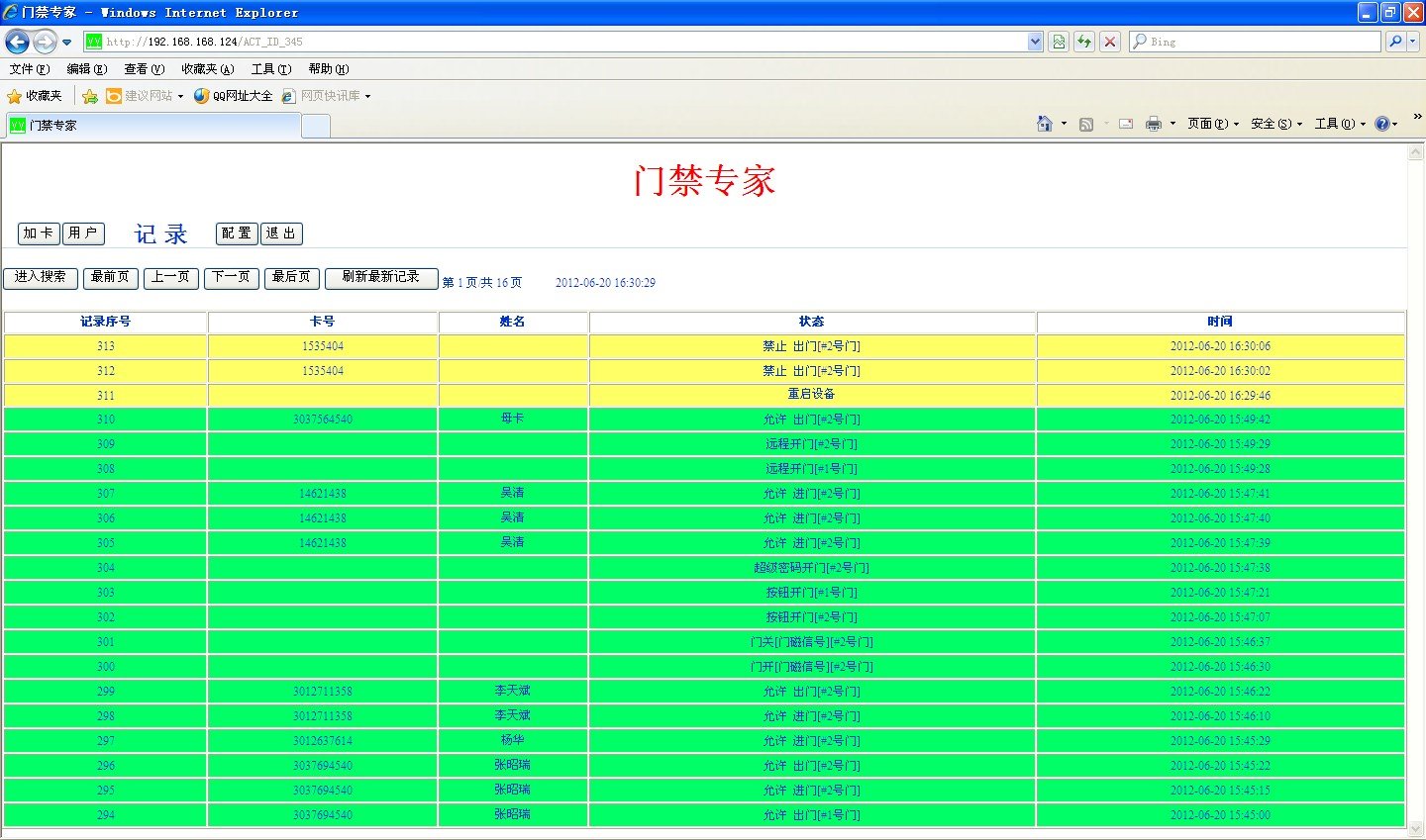 适用对象:所有的微耕旗下32位TCP/IP门禁控制器(WGACCESS、Adroitor、ADCT)均具备WEB管理功能。这些门禁控制器即可以配套相应的软件进行专业的门禁管理,也可以不安装任何管理软件,用户可以用网络内的任何一台电脑,甚至手机,IPAD等使用浏览器对门禁设备进行基本的管理和使用。 嵌入式IE设计,用户无需安装软件,但有直观的操作界面。 可存储10万条最近的带时间的刷卡记录,停电不丢失。 自带姓名记忆,且支持中文。 支持中文和英文操作界面。 支持手机和平板电脑的非IE浏览器操作。支持带免费虚拟域名的路由器进行远程和无线操作。可远程开门和监控门开关状态。 适用客户X 高端或者中端写字楼的小单位无需考勤功能的大门门禁或者内部门禁。 |