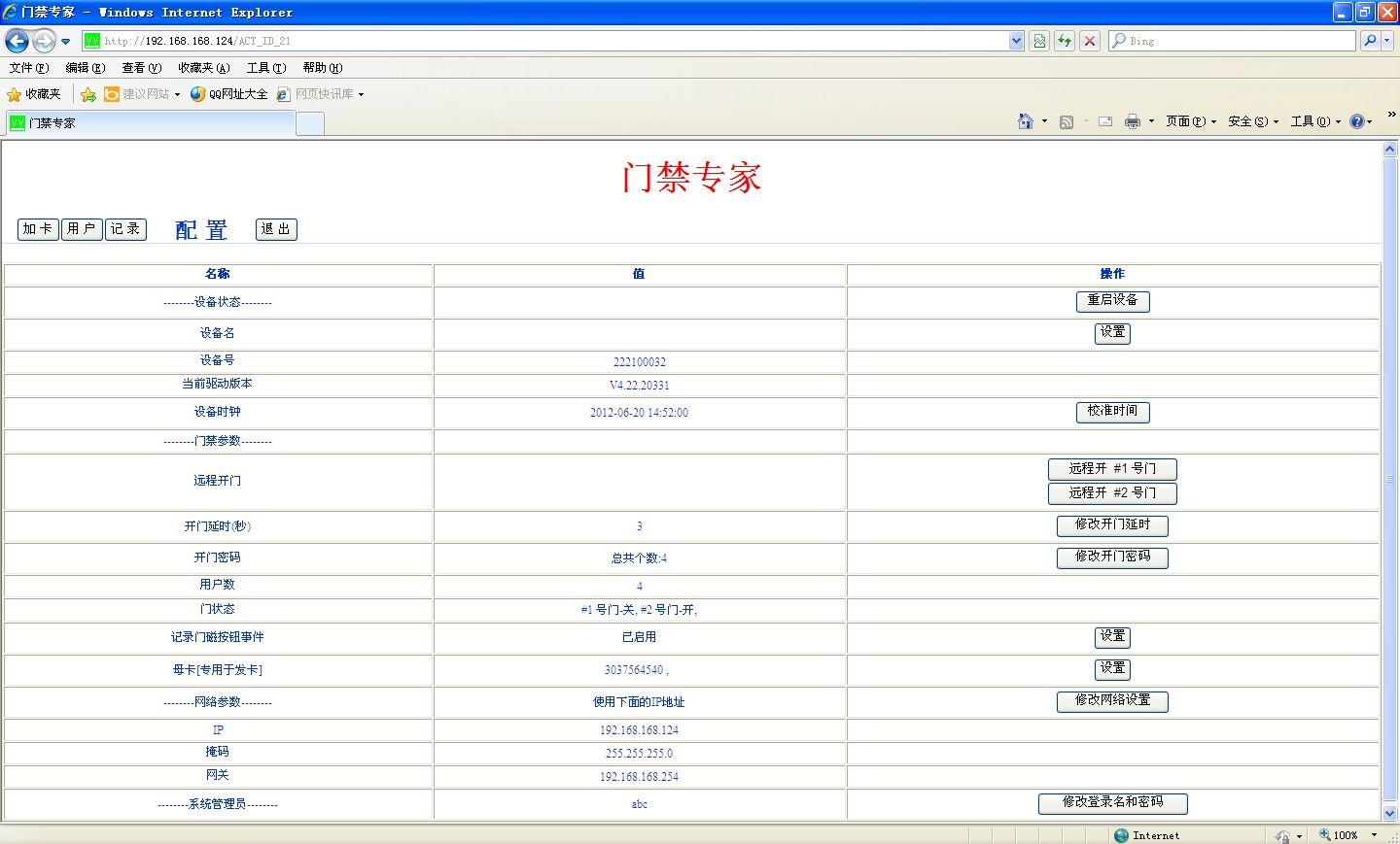 应用举例: 案例一:一个小型公司,不需要考勤,只需要基本的门禁管理,不需要安装复杂的门禁软件,任何一部电脑或者手机都可以对门禁进行设置和管理,这样的好处是,随时随地可以进行门禁的设置和管理,不用担心电脑坏了数据丢失,无需备份数据。 案例二:一个家庭安装了具备web功能的门禁控制器,父母可以在任何一个有网络有电脑或者手机等上网设备,进行查询孩子是否放学回家了,几点回家的。如果孩子忘记带卡开不了门,可以打个电话给父母,他们任何一个人都可以远程帮助孩子打开家门。 设备参数: 型号:所有的微耕旗下32位TCP/IP门禁控制器(WGACCESS、Adroitor、ADCT)均具备WEB管理功能。 支持母卡功能:使用母卡可以便捷地对其他卡就行快捷地授权,母卡自己也可以单独使用。 带用户名和密码进入安全机制。 |